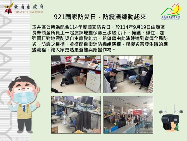 玉井區公所為配合 114 年度國家防災日,於 9 月 19 日 由顏振羽區長帶領全所員工,一同進行地震保命三步驟演練:趴下、掩護、穩住