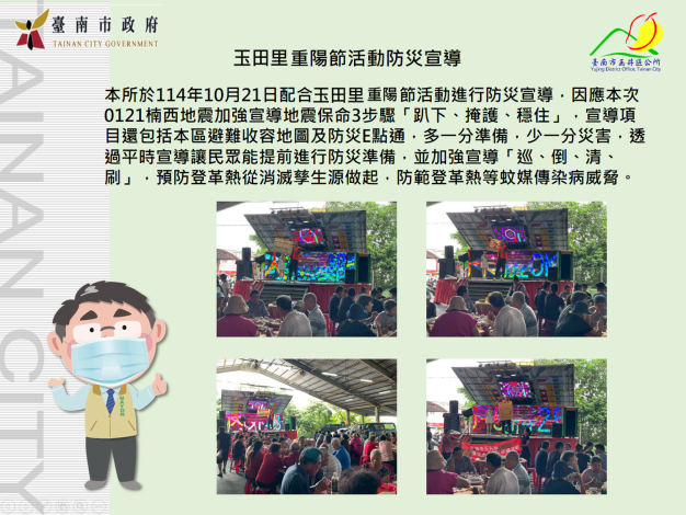 114年10月21日玉田里重陽節活動防災宣導短網址:https://p.tainan.gov.tw/eYwPp1
