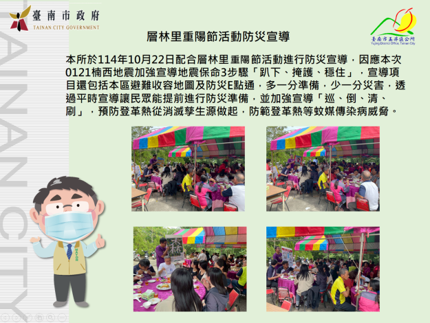 114年10月22日層林里重陽節活動防災宣導短網址:https://p.tainan.gov.tw/l9mk7