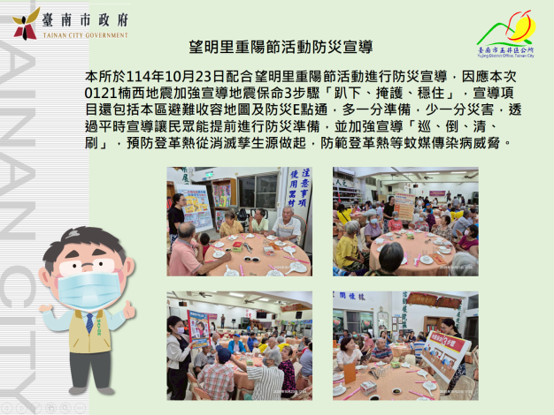 114年10月23日望明里重陽節活動防災宣導短網址:https://p.tainan.gov.tw/pPygL